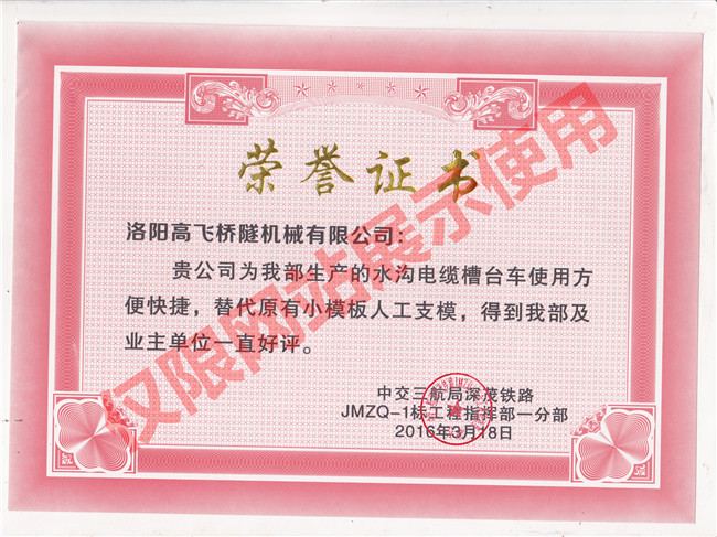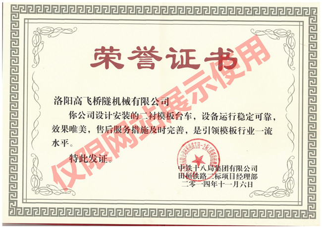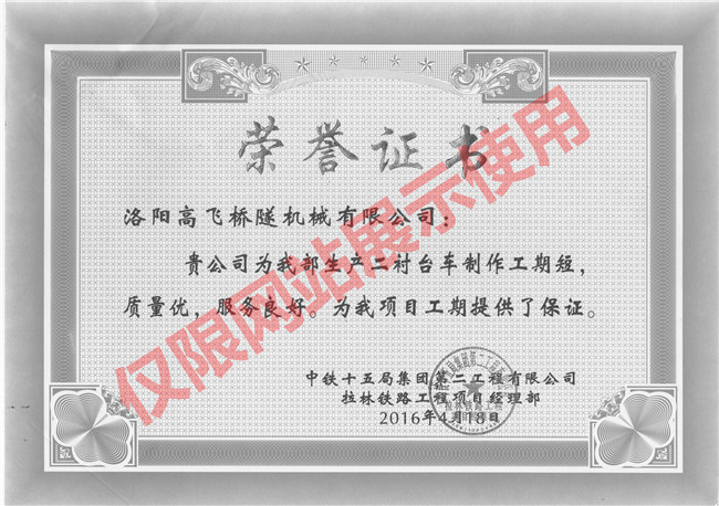 田恒鐵路項(xiàng)目榮譽(yù)證書