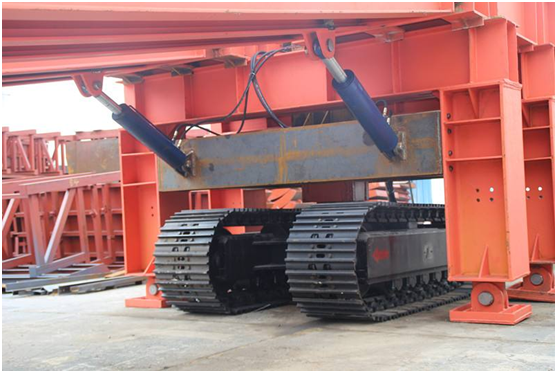 棧橋平移時(shí),收起棧橋行走支架,將棧橋前后兩端支架支撐在地面上,放下行走支架,使前端支架脫離地面,控制前后端支架中的平移油缸,使棧橋橋身整體左右平移,把前后棧橋放置在地面上,運(yùn)輸車(chē)輛即可在棧橋上通行,在棧橋下方進(jìn)行仰拱的施工。由于主橋的跨度大可以同時(shí)進(jìn)行仰拱的開(kāi)挖和仰拱回填施工,出渣等。棧橋前進(jìn)時(shí),放下行走支架和后段行走驅(qū)動(dòng)裝置,使前后端支架脫離地面,開(kāi)動(dòng)行走驅(qū)動(dòng)馬達(dá),使棧橋整體向前方移動(dòng)到預(yù)定位置,行走驅(qū)動(dòng)裝置采用橡膠輪胎行走,無(wú)需鋪設(shè)鋼軌,可適用于各種開(kāi)挖方式和不同工況,并且可以隨時(shí)自由轉(zhuǎn)換,操作簡(jiǎn)單、靈活,使用面極其廣泛。