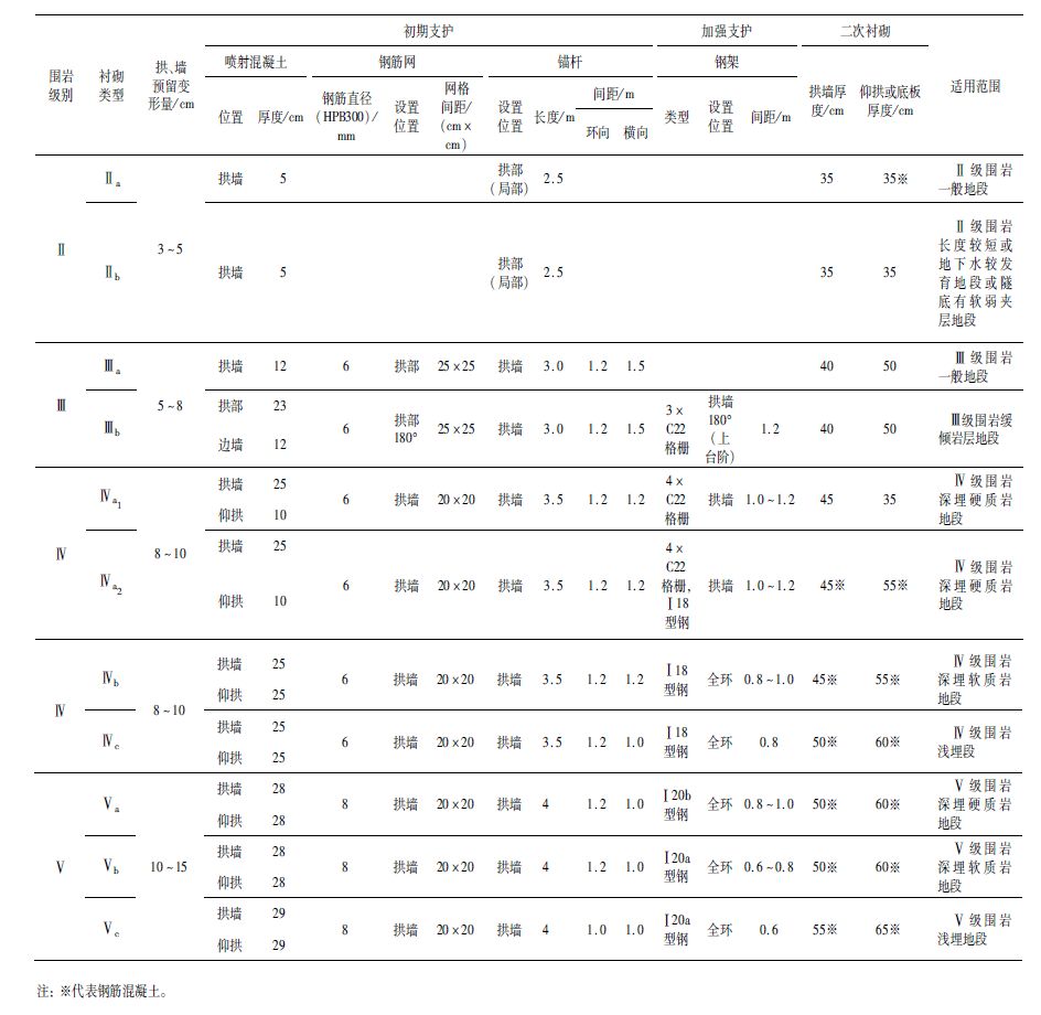 基于新奧法理念,隧道支護(hù)結(jié)構(gòu)設(shè)計中將圍巖和初期支護(hù)作為承載主體,承擔(dān)部圍巖荷載,二次襯砌作為安儲備。