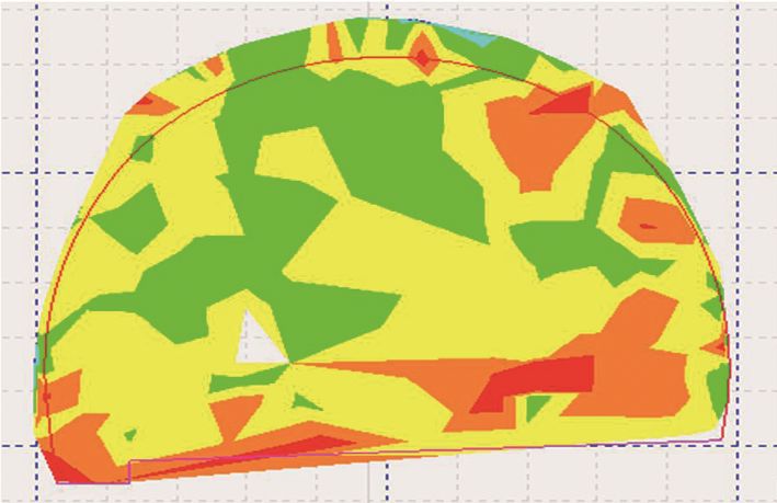 其中,超前鉆孔及加深炮孔法主要利用電腦三臂鑿巖臺車進(jìn)行超前地質(zhì)預(yù)報,進(jìn)行鉆孔作業(yè)時,實時監(jiān)測推進(jìn)速度、沖擊壓力、推進(jìn)壓力、回轉(zhuǎn)壓力、水壓力和水流量等參數(shù),并通過MWD軟件分析復(fù)原地質(zhì)情況(MWD地質(zhì)云圖如圖7所示),形成地質(zhì)報告,由此可建立隧道大數(shù)據(jù)地質(zhì)庫。